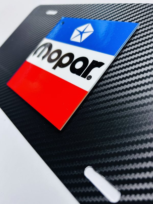 OEM 3D Dodge Mopar Chrysler Shield Carbon Fiber License Plate New (1)PC Licensed Product Thin Aluminum Rare! Fits Challenger / Charger / Ram / Jeep / Magnum / 300